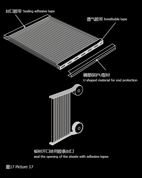 D.確保根據(jù)具體應(yīng)用情況使用適當?shù)姆饪谀z帶,注意:在彎曲安裝的情況下,因為板材兩端開口均向下所以兩端都使用專用透氣膠帶封口。注意對端部封口膠帶的保護,避免在安裝型材時損壞,可以采用聚碳酸酯U型材進行保護 (圖一17C)