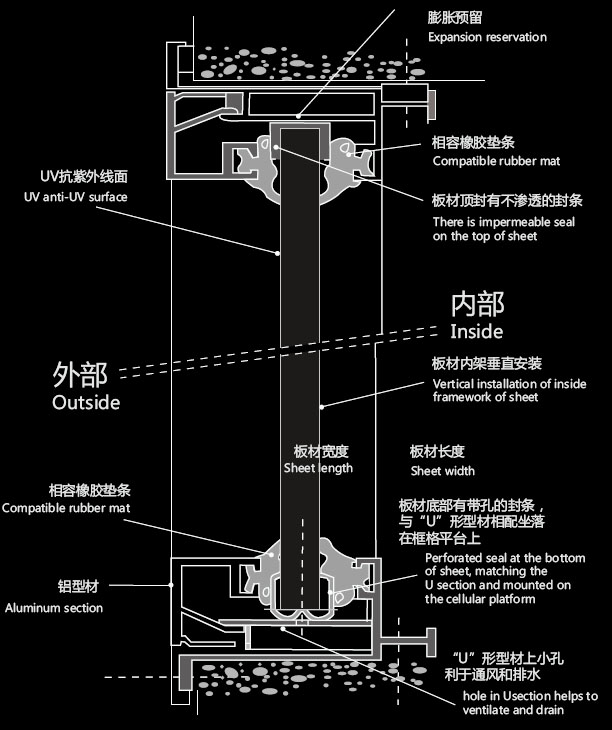 d. PC板應(yīng)順骨架方向安裝,使水滴下滑。板頂邊應(yīng)用防滲防塵鋁箔帶密封。板底邊用特制有孔透水式鋁箔帶封底可使冷凝水流走。