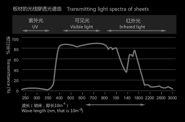 下圖為陽(yáng)光板的透光光譜圖,從圖上可以看出,波長(zhǎng)短于350nm的紫外線幾乎不穿透陽(yáng)光板。