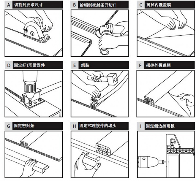 U型材(PC或鋁制)或鋁制F型材密封住板材的上端。